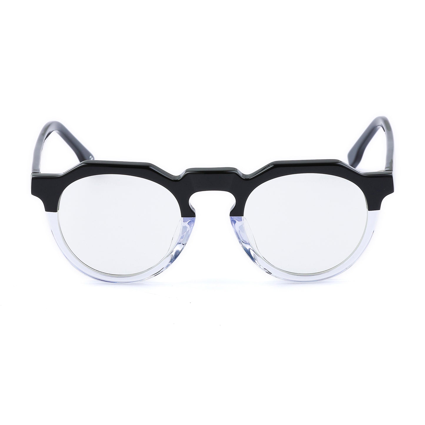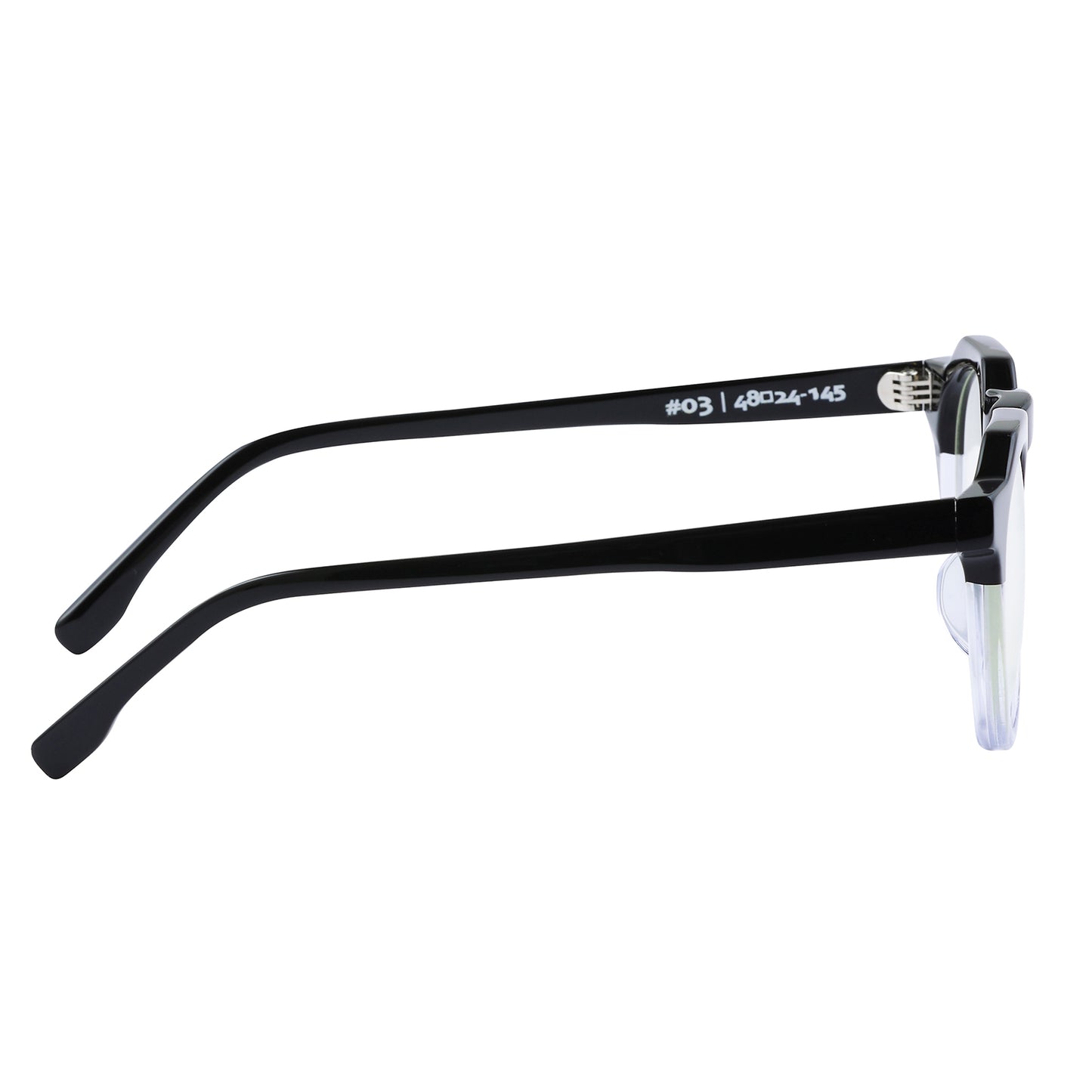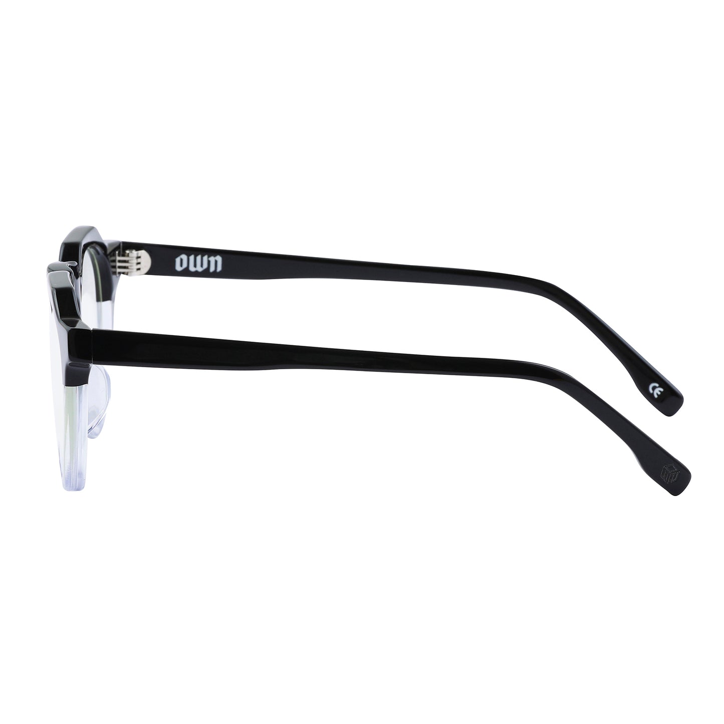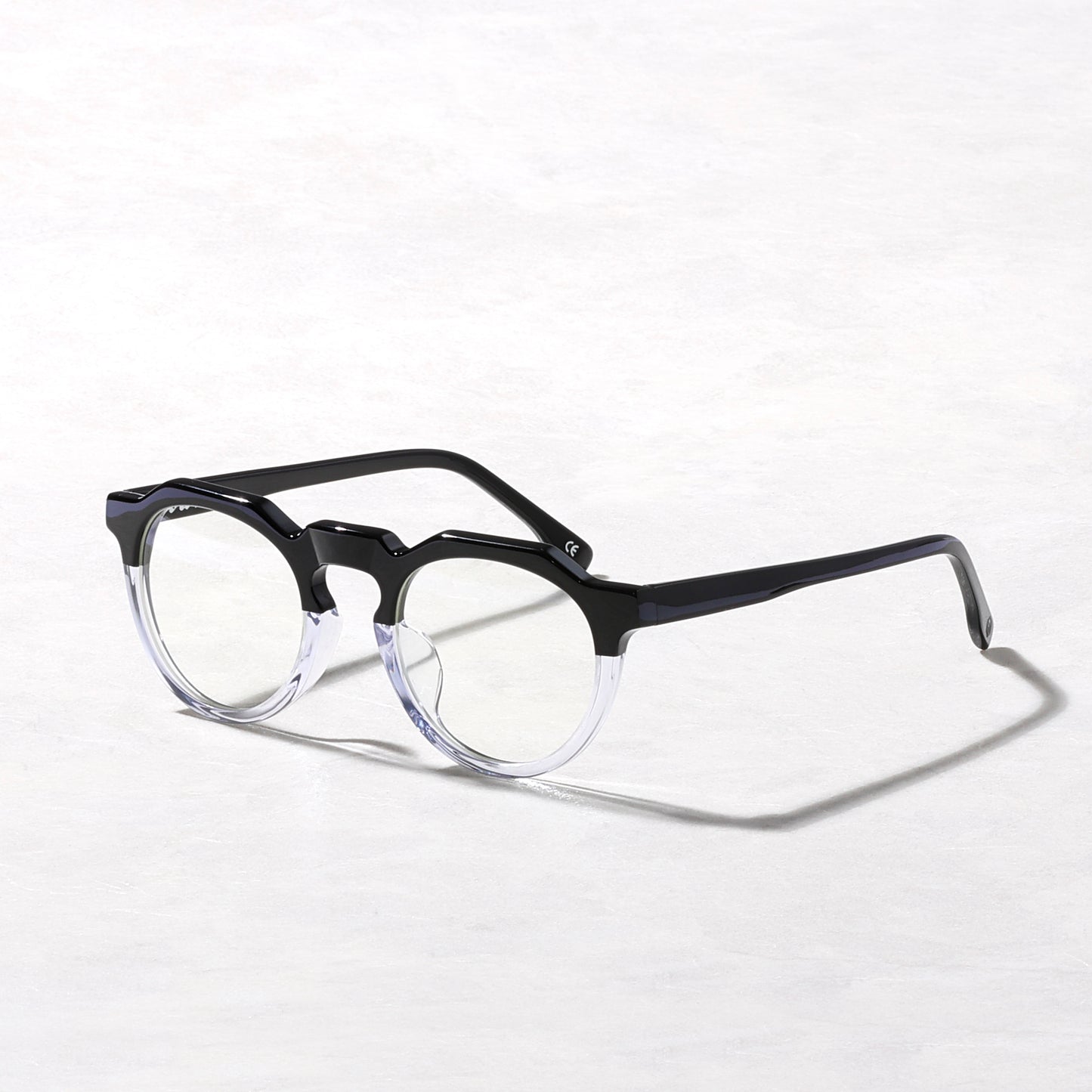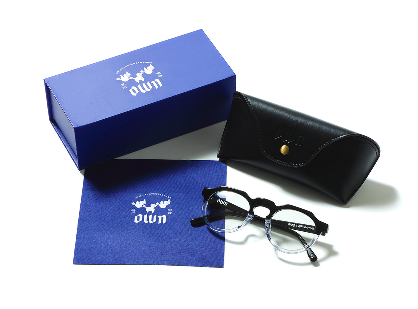 この様な型は、顔の中心に眼鏡が寄ってしまいがち(顔幅広めの日本人は特に)。そうならない様、デザイナーがレンズ/ブリッジ/ヨロイ、それぞれに少しずつ幅を出しながら、絶妙のバランスでひたすら調整し、設計したモデル。